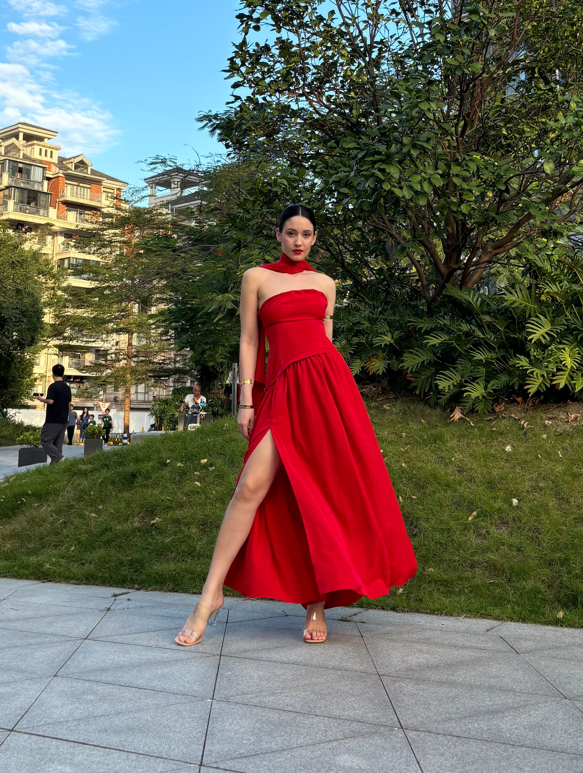 Red Dubai Fabric Shawl Dress