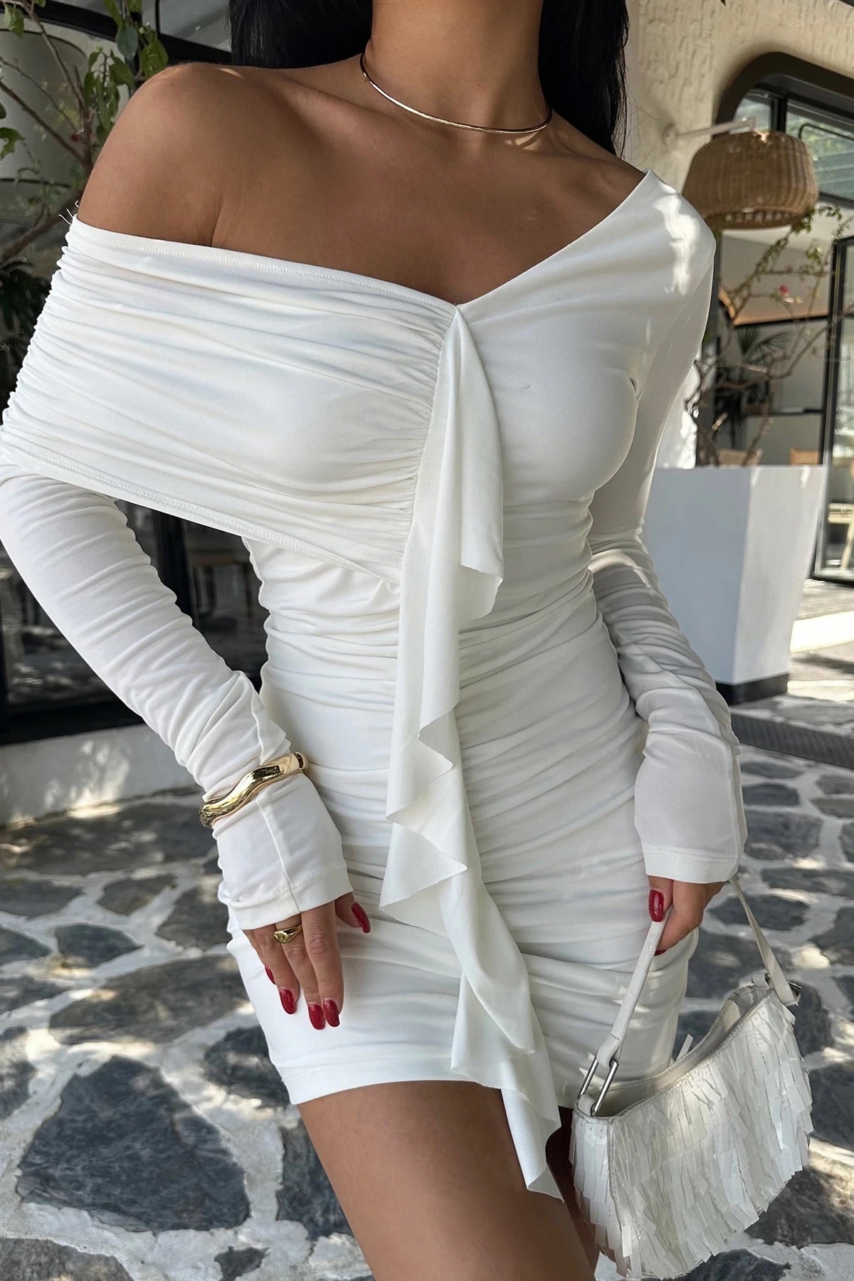 White Ruffle Detail Mini Dress